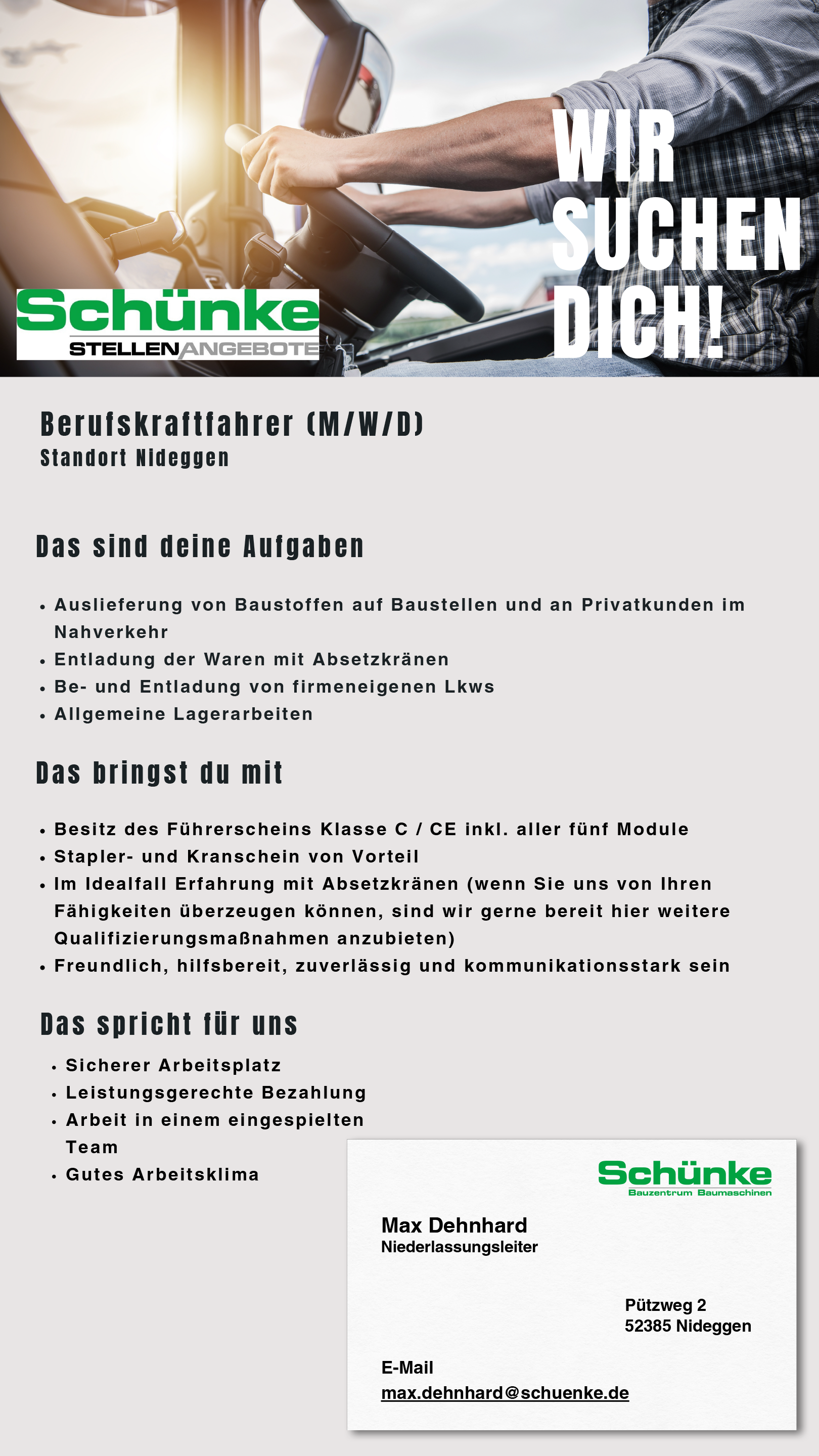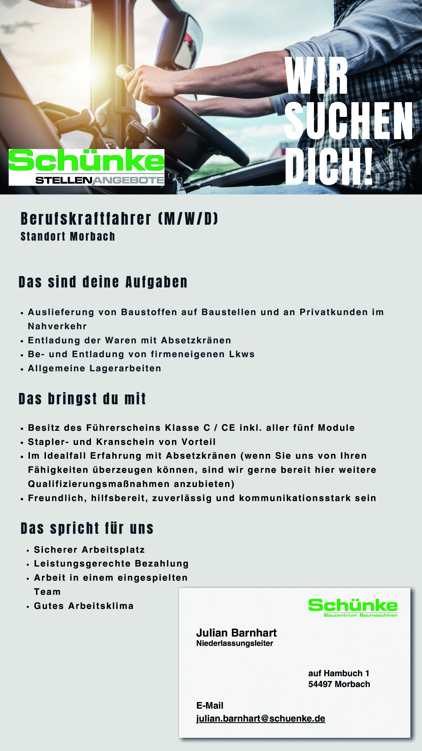 Julian Banhart, Niederlassungsleiter, Auf Hambuch 1, 54497 Moorbach, E-Mail: julian.barnhart@schuenke.de